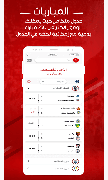 تحتوي هذه النسخه علي 7 اقسام منهم قسم المفضلة حيث يمكنك الاحتفاظ بمباريات واحصائياتك بكل سهولة داخل القسم كما تحتوي علي قسم المباريات جيث يمكنك مشاهده لايف داتا الخاصه بمباراة واحصائيات الخاص بها والكثير لتعرفه عن المباراة , ويشمل التطبيق قسمي الاخبار والفيديوا حيث يمكنك متابعه احدث الاخبار والفيديوهات وايضا الدردشه حيث يمكنك الاستمتاع بدردشه مع جميع المستخدمين والتعرف الي اصدقاء جدد عن طريق التطبيق